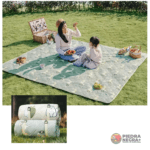 -Alfombra de picnic ultrasónica Naturehike Happy Series, un accesorio diseñado para actividades al aire libre como camping, picnics en parques o días de playa, incluye correa de transporte de cuero sintético o lona que la hace ver muy estética y fácil de llevar.